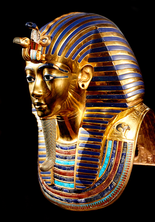 When the sarcophagus was finally opened, Carter found three mummiform coffins. The outer two were made of wood gilded with gold, but the innermost coffin (the one that held Tut's body) was crafted from solid gold. Finally, inside all these layers of protection, was Tutankhamun's mummy. It was wearing a gold funeral mask with inlaid glass, lapis lazuli and red carnelian. Gold bands, inscribed with magical spells to guarantee entrance to the afterlife, surrounded the linen bandages. Gold hands holding the crook and flail were sewn on to the wrappings over the chest.